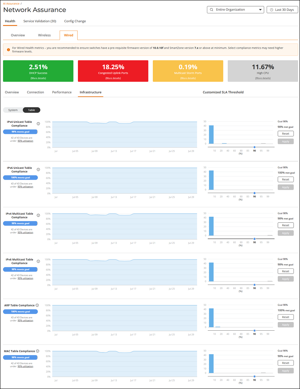 On the Health page, the Wired tab is designed to facilitate KPI and service level agreement (SLA) tracking, allowing for real-time monitoring and management of network health. KPIs are organized into four categories: Overview, Connection, Performance, and Infrastructure. Each category provides access to specific health data relevant to the KPI metrics in each section, enabling you to pinpoint and address issues efficiently. Additionally, custom SLA thresholds can be configured for a subset of these KPIs, offering tailored monitoring and alerting based on specific network requirements.