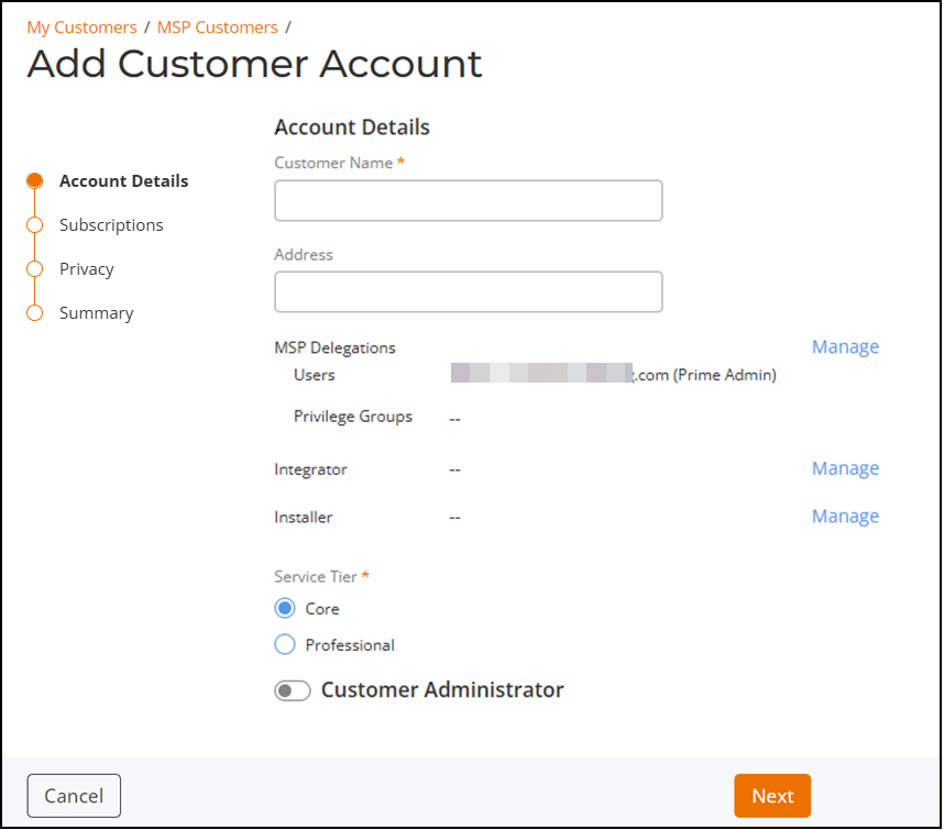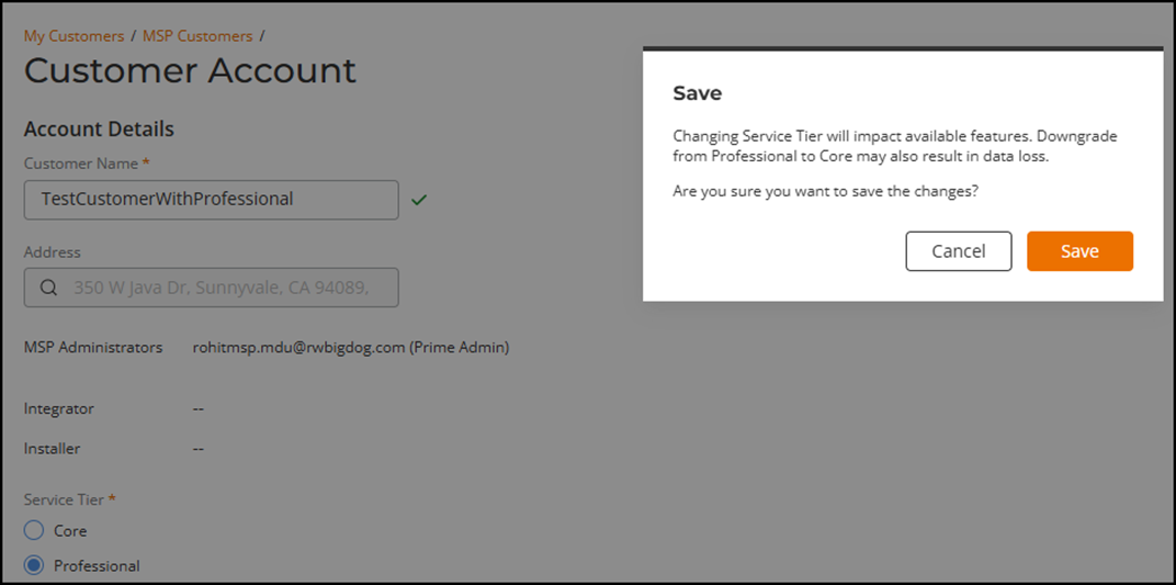 You can add or edit an end customer to assign or update a service tier. The service tier determines which features are available for that customer’s account. This section focuses only on service tier selection and changes for MSP HSP Edition and MSP MDU Edition.