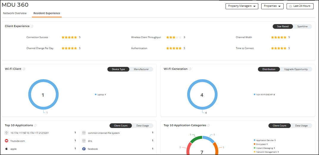 The MDU 360 dashboard provides insights into resident network usage, connectivity quality, and service responsiveness—helping property managers and service providers maintain high satisfaction and proactively address performance issues.