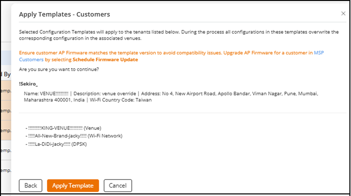 The selected templates are applied to the selected customers, and any overridden values update the corresponding settings in the associated venues.