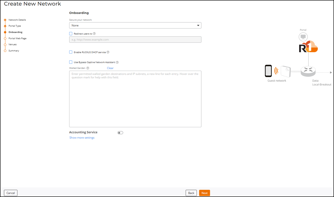 - (Optional) Enable RUCKUS DHCP service: Select the Enable RUCKUS DHCP service checkbox to automatically create and assign a new DHCP-Guest Service and DHCP Pool for Guest WLAN-related venues that do not have a specified DHCP Service. Refer to the DHCP Service of each Venue for more information.