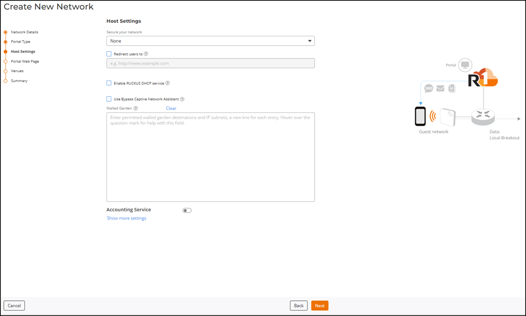 The structure diagram on the right updates to show the Captive Portal Guest Pass network type. - Click