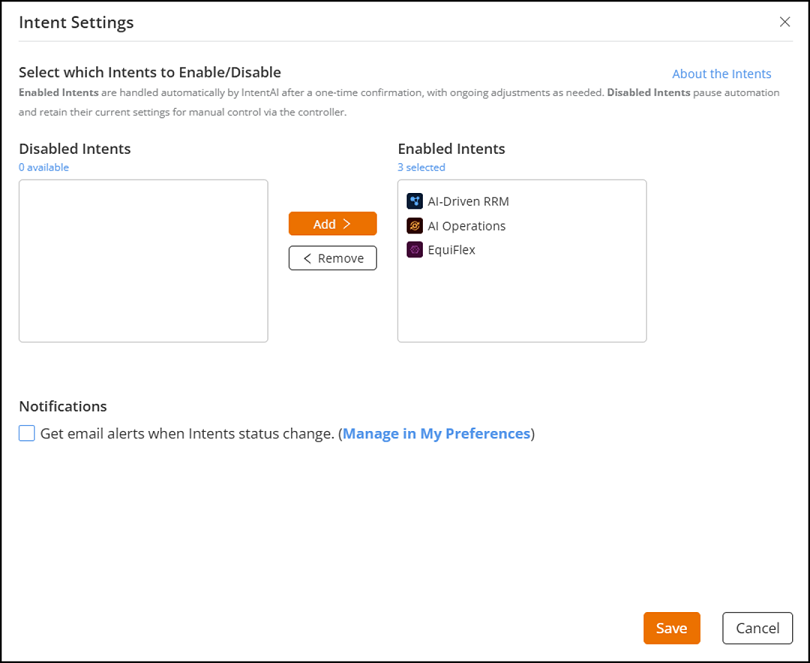 From the navigation bar, select AI Assurance > AI Analytics > IntentAI. The IntentAI page is displayed.