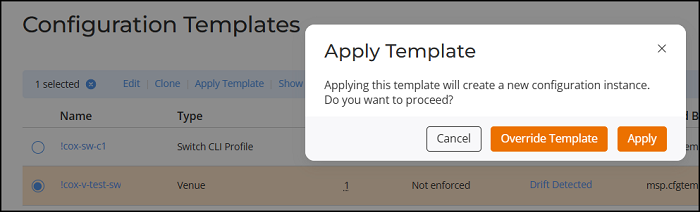 In the Apply Template dialog box, click Override Template to replace the existing configuration or Apply to create a new configuration.