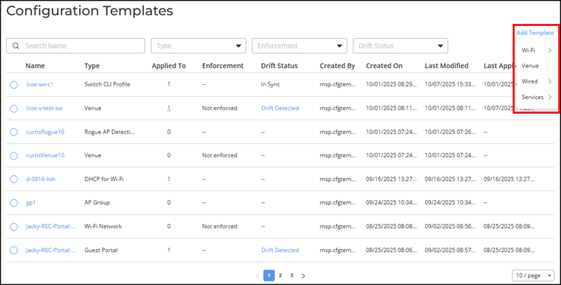 You can use the Search option to display only the table entries matching the specified name; enter a minimum of two characters. Additionally, you can filter the list of configuration templates by selecting options from the drop-down menus of the Type, Enforcement, and Drift Status fields. The type menu supports multiple selections, including Access Control, AP Group, Application Policy, Device Policy, DHCP for Wi-Fi, DPSK, Guest Portal, Layer 2 Policy, Layer 3 Policy, RADIUS Server, Rogue AP Detection, Switch CLI Profile, Switch Regular Profile, Syslog Server, Venue, VLAN Pool, Wi-Fi Calling, and Wi-Fi Network. The enforcement options are Enforced and Not Enforced. The drift status options are Drift Detected and In Sync. Use the Clear Filters option to remove the applied filters.