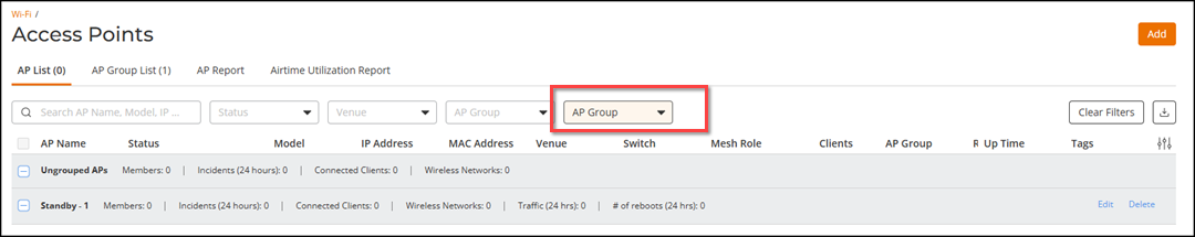 You can filter the list of APs using one or more of the drop-down lists above the table: Status, Venue, and AP Group, as well as organize the list of APs by selecting one of the Group By criteria.