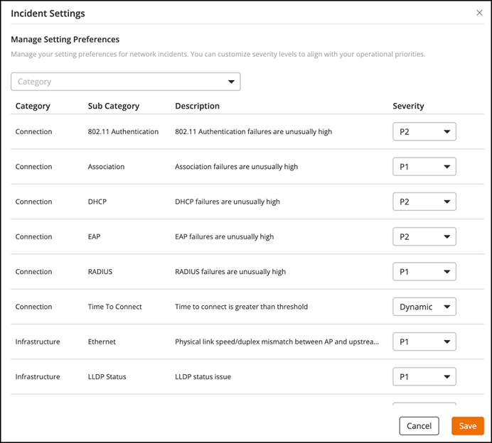 - Category: Indicates the functional classification of the incident based on its nature or impact area, such as Connection, Performance, Infrastructure, or Security. You can filter incidents by category using the Category drop-down above the table.