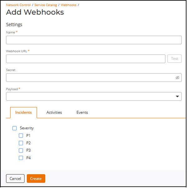 - Add the Webhook service to your tenant account. From the navigation bar, select Network Control > Service Catalog. Alternatively, you can select Network Control > My Services, then click Add Service.