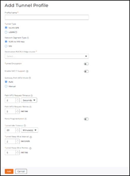 - Destination RUCKUS Edge cluster: Destination Edge cluster name, which is used for AP to cluster or DMZ tunnels. A Tunnel Profile which is intended to be used for an AP to cluster configuration must have an Edge cluster already configured. Select the destination cluster from the drop-down.