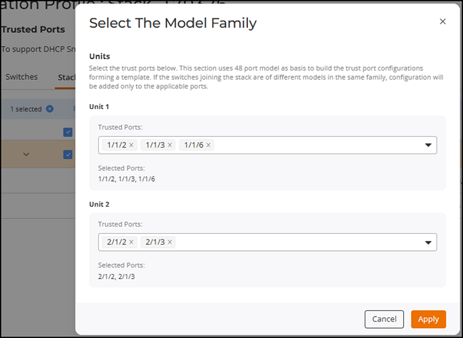 including VLANs, ACLs, Port Profiles and Trusted ports against selected