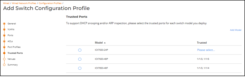 - (Optional) Click Add Model if your deployment includes different switch models or if you did not define switch ports on the Ports page in the wizard. Each switch uses the trusted ports configured for its model. Select the required switch Family and Model on the Select Ports by Model page, click Next, select up to four Trusted Ports model, then click Add.