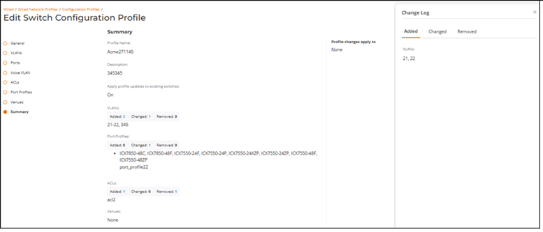 Note: The Summary page displays a limited preview of configuration details. VLANs are shown up to a maximum of 20 entries, Port Profiles up to 3 models, ACLs up to 10 entries, Venues up to 10 entries, and the Profile changes apply to list shows up to 25 switches.