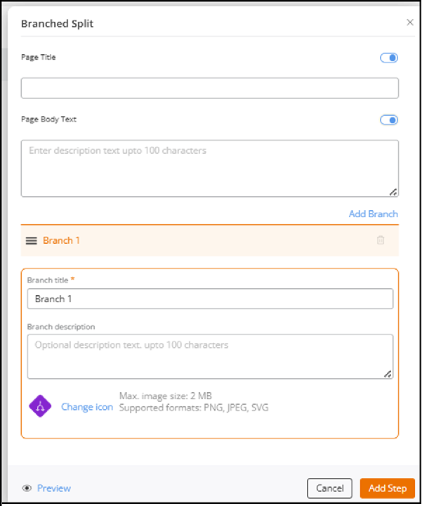 - Page Title: Toggle the switch on to enter a name for the page that appears when users reach the split step in the workflow. This title helps users understand the purpose of the choice screen.