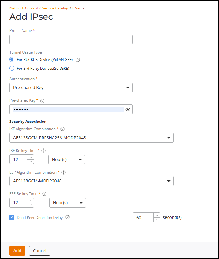 - Security Gateway: Enter the IP address or fully qualified domain name (FQDN) of the IPsec server. The IP address format depends on the IP mode configured on RUCKUS One. Only IPv4 is supported.
