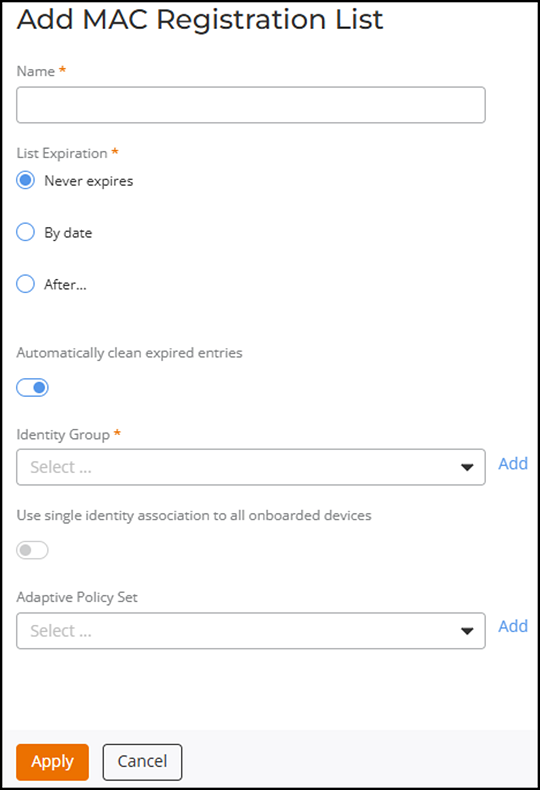 Note: Each SSID can be associated with only one MAC Registration List.Note: Adaptive policy sets configured with the MAC registration list will not be applied, as the external AAA authentication process occurs after the policy evaluation stage. -