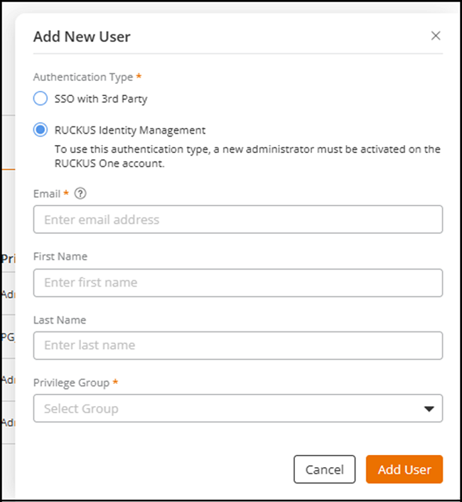 - To use the RUCKUS Identity Management authentication type, a new administrator must be activated on the RUCKUS One account.