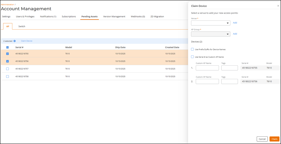 allows you to view your list of purchased Access Points (APs) that are not yet claimed. For