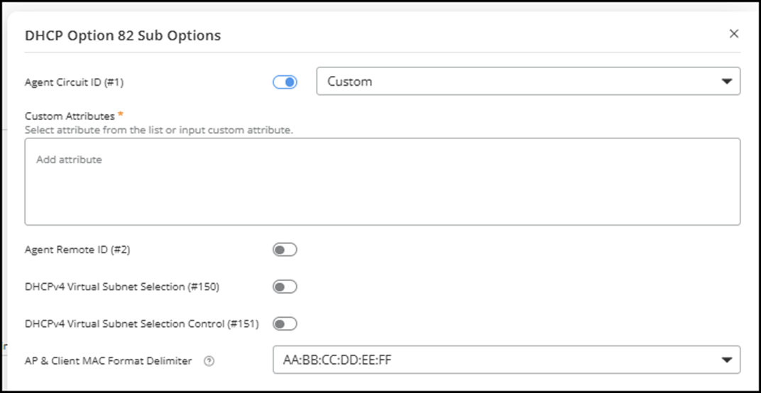 attribute can be added only once. - Agent Remote ID (#2): Click the toggle to enable this option, then select the identifier for the AP forwarding the DHCP request from the drop-down list.