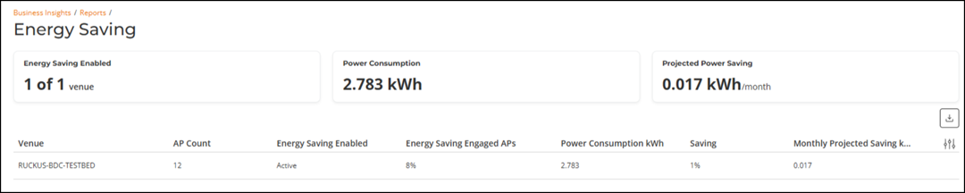 The Energy Saving report provides details of energy consumption and savings across all venues, including the number of venues with Energy Saving enabled, total power consumption, and projected monthly power savings. The report also includes venue-level details such as AP count, Energy Saving status, engaged APs, consumption, and savings metrics.